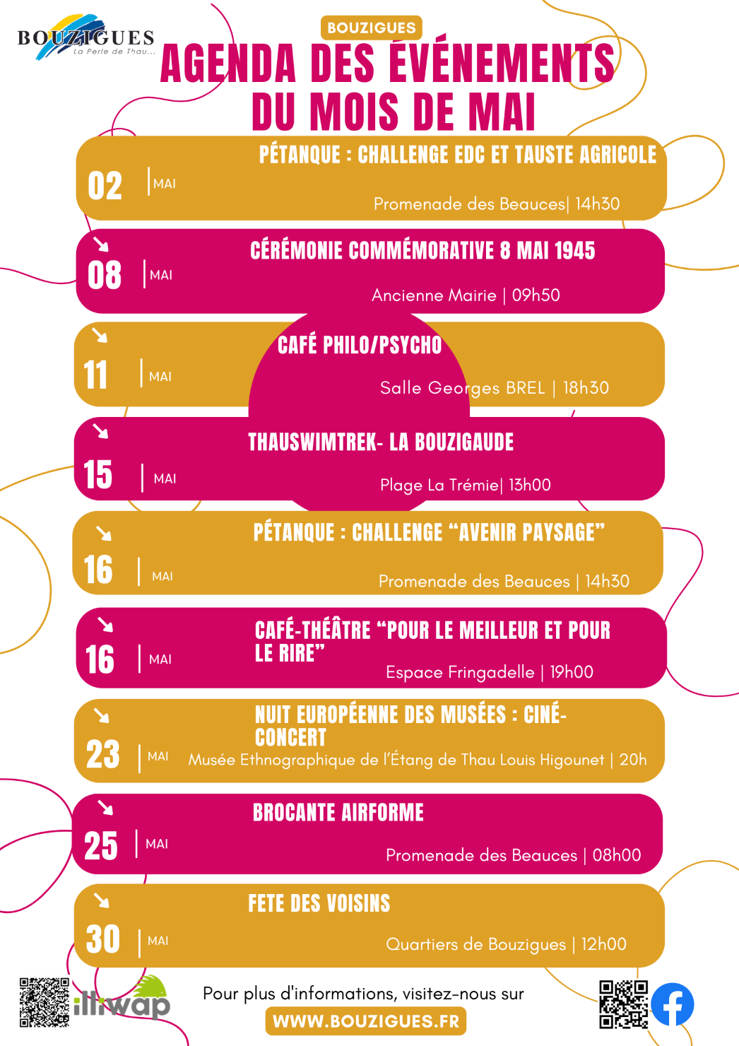 Agenda des manifestations du mois de Mai Galerie Agenda des manifestations du mois de Mai Actualités Agenda des manifestations du mois de MaiQue faire durant le mois de mai? Notre programme de manifestations est disponible ! À [LIRE LA SUITE...]